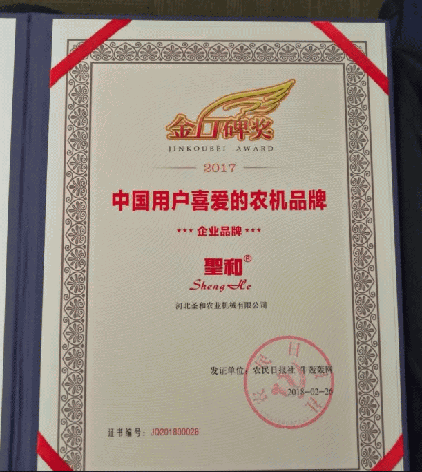 圣和公司等全國30個產(chǎn)品品牌分別獲得“中國用戶喜愛的農(nóng)機品牌”榮譽稱號,并上臺領(lǐng)獎。圣和代表發(fā)言:獲獎是全體圣和人辛勤耕耘的碩果,但獲獎只是代表過去。圣和人要把今天的成就作為明天繼續(xù)進步的動力,不斷創(chuàng)新產(chǎn)品,不斷提升質(zhì)量,為國家鄉(xiāng)村振興大業(yè)精心發(fā)力,農(nóng)民的期待是我們的發(fā)展方向。