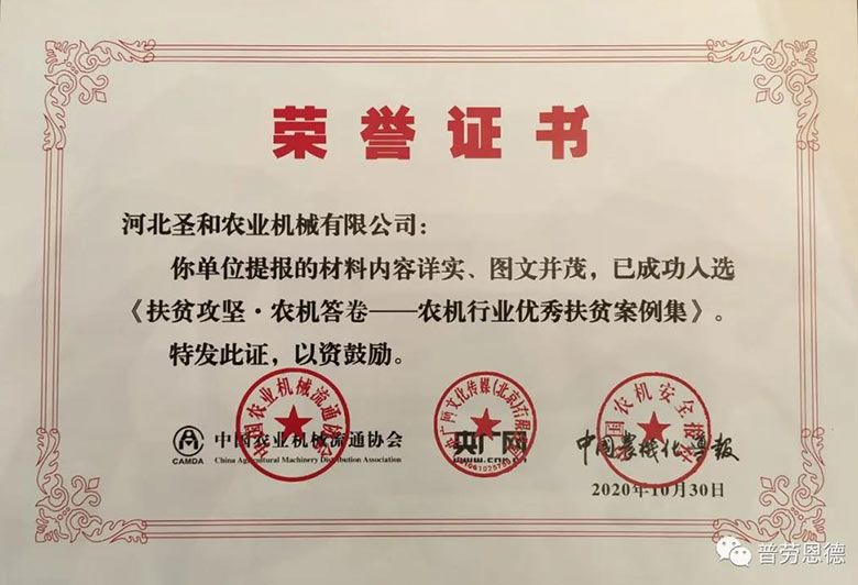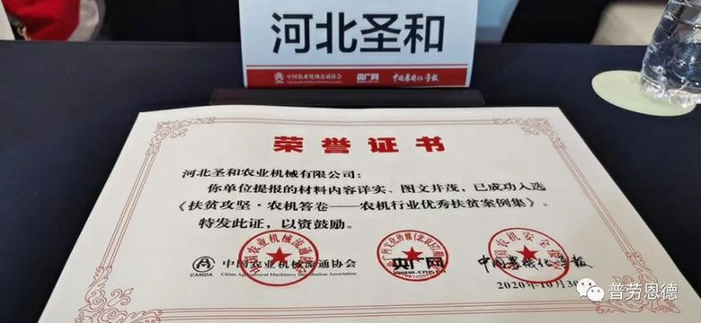 《農(nóng)機(jī)行業(yè)優(yōu)秀扶貧案例集》,入選案例榮譽(yù)證書(shū)頒發(fā)儀式同期舉辦!圣和是唯一入選的河北生產(chǎn)企業(yè)!