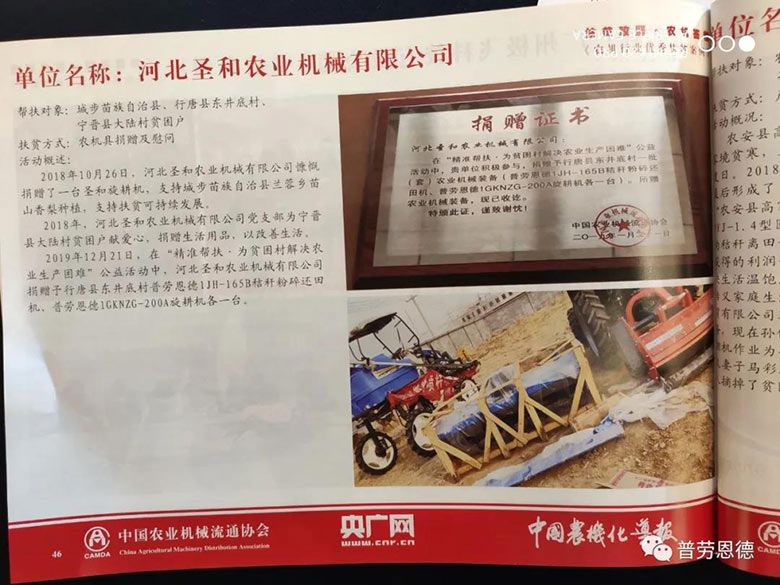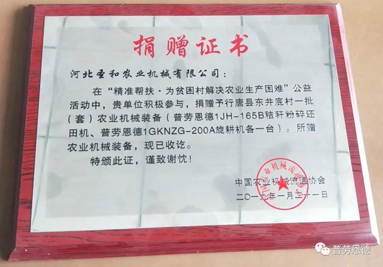 3、2019年12月21日,在“精準(zhǔn)幫扶·為貧困村解決農(nóng)業(yè)生產(chǎn)困難”公益活動(dòng)中,河北圣和農(nóng)業(yè)機(jī)械有限公司捐贈(zèng)予行唐縣東井底村普勞恩德1JH-165B秸稈粉碎還田機(jī)、普勞恩德1GKNZG-200A旋耕機(jī)各一臺(tái)。